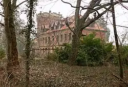 Das 1865 erbaute Schloss ist ein zweigeschossiger winkelförmiger Backsteinbau mit einem mittigen achteckigen Eingangsturm, der von Zinnen bekrönt ist. Vom Stil her erinnert das Bauwerk an den britischen castle style, verbindet aber einheimische mit britischen Bautraditionen. Das Schloss weist Backsteinarchitektur, helle Sandsteingliederung und gotisierende Anleihen auf.
