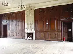 Um Platz für die Bewohner des Altenheims zu schaffen, erhielten zwei der eingeschossigen Verbindungsbauten durch eingezogene Zwischendecken ein zusätzliches Stockwerk, die hohen Fenster wurden geteilt. Die einstigen Wirtschaftsräume wurden so völlig zerstört.[46] Das östliche Verbindungshaus und die Reithalle nahmen die Pflegestation des Heims auf, was ebenfalls einen völligen Umbau erforderte.[47] Weiterhin wurden in einigen der Salons des Hauptgebäudes Waschgelegenheiten eingebaut, die zu Feuchtigkeitsschäden an den Täfelungen führten. Die Wände der Innenräume wurden mehrfach übertapeziert, Türrahmen und Kamine mit Ölfarbe gestrichen und die Dielenfußböden mit Linoleum belegt, was zum Teil die Bildung von Schimmel zur Folge hatte. Bauschäden aus der Altenheimzeit wurden zumeist nur provisorisch behoben, sodass sich das Schloss 1994 in einem stark sanierungsbedürftigen Zustand befand. Weiterer Verfall erfolgte in den nächsten zehn Jahren des Leerstands, obwohl in einer ersten Sicherungsmaßnahme von 1996 bis 1997 der Dachstuhl des Corps de Logis vom Hausschwamm befreit und die Decke des Festsaals restauriert worden war.[37] Trotz der jahrzehntelangen Vernachlässigung des Gebäudes sind zahlreiche Details der barocken Ausstattung erhalten geblieben.