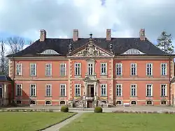 Das Corps de Logis enthielt die Wohn- und Repräsentationsräume der gräflichen Familie. Über die hofseitige Freitreppe betritt man ein Vestibül, das mit dem dahinterliegenden Weißen Saal verbunden ist. Das Vestibül ist mit stuckierten Reliefs des ersten Schlossbewohners und seiner Frau geschmückt, der Weiße Saal diente als Gartensalon und ist durch eine nördlich gelegene Freitreppe mit dem Park verbunden. Auf ein zentrales Treppenhaus – zur Barockzeit durchaus üblich – wurde im Corps de Logis verzichtet, die große Hauptstiege befindet sich rechts der Eingangshalle. Der bedeutendste und zugleich größte Raum des Gebäudes ist der mit dunklen Vertäfelungen ausgestattete Festsaal im Obergeschoss, der aufgrund der früher dort präsentierten Gemälde auch als Ahnensaal bezeichnet wurde. Als wichtigster Saal des Schlosses übernahm er repräsentative Aufgaben, diente aber zugleich durch seine zentrale Lage zur Verbindung der Appartements miteinander. Der Ahnensaal blieb verhältnismäßig gut erhalten, der Deckenstuck wurde bereits in den Jahren 1996 bis 1997 restauriert.[36] Als kunsthandwerklich herausragend gilt das sogenannte Intarsienkabinett an der westlichen Hofseite.[37] Die frühere Nutzung der Wohnräume des Corps de Logis kann heute nicht mehr genau festgestellt werden, da sie nach den Bedürfnissen der Bewohner im Laufe der Generationen verschiedene Zwecke erfüllten.[38] Sie dienten über einen Zeitraum von mehr als zweihundert Jahren als Salons, Schlafräume, Arbeits- und Empfangszimmer und waren, wie Fotos des 19. und frühen 20. Jahrhunderts belegen, umfangreich und wohnlich mit Möbeln, Gemälden und Kunstgegenständen ausgestattet.[39]