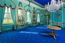 Im Inneren sind die Salons aus der Zeit um 1860 und das Speisezimmer mit Stuckdecke sowie Boiserien und Möbeln aus der Neurenaissance hervorzuheben. Der parkseitige Grüne Saal ist mit einer Stuckzierdecke aus Musikinstrumenten, Gehängen und Medaillons ausgestattet. Das Vestibül zeigt eine Ahnengalerie der Familien von Pückler und von Callenberg. Die historisch gewachsene Pückler-Callenberg-Bibliothek umfasst 4.500 Bände und ist bis heute im Besitz der gräflichen Familie von Pückler.[12] In den Fürstenzimmern im Obergeschoss sind Werke der Carl-Blechen-Sammlung der Stadt Cottbus mit Gemälden von Blechen, August Wilhelm Schirmer, Friedrich August Elsasser, Johan Christian Clausen Dahl aber auch Adolph von Menzel, Max Liebermann und Lovis Corinth ausgestellt.[13] Seit Mai 2022 sind die berühmten Orienträume des Fürsten mit farbenprächtigen Papiertapeten und seiner Orientsammlung wieder zu sehen.[14]