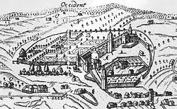 Schloss Broich um 1775 aus: Prospect des Schloses bruch und Mühlheim sambt der gegend von Johann Jacob Becker