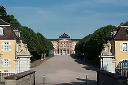 Die Schönbornstraße (Bundesstraße 3, hier nahezu identisch mit dem Verlauf der Römerstraße entlang der Bergstraße), die quer durch den Schlossbereich verläuft, schließt im Norden mit dem Damianstor ab, Stadt- und Schlosstor zugleich, welches aber nie militärischen, sondern nur rein repräsentativen Zwecken diente. Im Süden, zur Stadt hin, wird sie durch den Großen Dienerbau und das Priesterseminar flankiert. Durch diese Gebäude ergibt sich die größte Abweichung von der strengen Symmetrie der Schlossanlage. Um letztere nicht zu stören, wurde der Turm der Hofkirche auf der vom Ehrenhof abgelegenen Seite errichtet. Hinter dem Priesterseminar liegt als Ökonomiegebäude der sogenannte Bandhof.