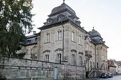 Das ehemalige Amtsschloss des Klosters Ebrach wurde 1720 bis 1725 vermutlich nach einem Entwurf von Joseph Greissing errichtet, in dessen Planung dann Balthasar Neumann eingegriffen haben dürfte. Um einen quadratischen Gebäudetrakt in der Mitte, der einen einzigen, großen Festsaal enthält, gruppieren sich vier Pavillons an den Ecken, deren Mansarddächer höher sind als die des übrigen Baus. An den vier Seiten des Mitteltraktes befinden sich Balkone. Die Wände des Gebäudekomplexes sind durch Pilaster gegliedert. Der Stuck des Festsaals aus der Erbauungszeit von Georg Hennicke ist erhalten.