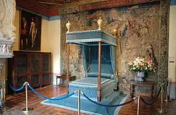Auf der gegenüberliegenden Seite des Vestibüls und damit über dem Zimmer Dianes de Poitiers liegt das einstige Schlafzimmer Katharinas von Medici (französisch Chambre de Catherine de Medicis). Wie Césars Raum verdankt dieses Zimmer sein heutiges Aussehen Restaurierungsarbeiten im 19. Jahrhundert. Er ist mit Möbeln sowie Wandbehängen aus dem 16. Jahrhundert ausgestattet und besitzt einen Renaissancekamin aus weißem Carrara-Marmor.[29] Wertvollstes Gemälde in diesem Raum ist Correggios Unterrichtung der Liebe als Öl-auf-Holz-Ausführung. Die Leinwandversion dieses Gemäldes befindet sich in der National Gallery London.