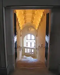 Ebenso wie mit dem Vestibül wurden in Chenonceau auch bei der Treppenform neue architektonische Wege beschritten. Thomas Bohier ließ eine an italienische Vorbilder angelehnte Treppe mit zwei geraden Läufen erbauen, anstatt auf das in Frankreich zu jener Zeit noch übliche Prinzip der Wendeltreppe zurückzugreifen. Sie ist damit die wahrscheinlich zweite je in Frankreich errichtete Treppe in dieser Form. Nur im Schloss Bury war schon zuvor eine solche Treppe realisiert worden, die jedoch heute nicht mehr erhalten ist.[28] Das Treppenhaus besitzt eine Decke in Form eines Tonnengewölbes mit Schlusssteinen und Kassetten nach antiker Art und führt in das Vestibül des ersten Geschosses, auch Vestibül Catherine Briçonnets genannt. Die Raumaufteilung dieser Etage ist – mit Ausnahme des Kapellanbaus – identisch mit derjenigen des Erdgeschosses.