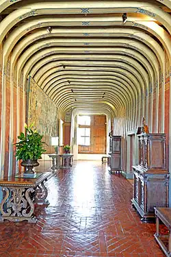 Das zentrale Vestibül orientiert sich gemeinsam mit der Treppe in die erste Etage an italienischen Vorbildern und bot erstmals eine Alternative zu der bis dahin in Frankreich üblichen Anordnung der Räume entlang einer langen Galerie.[24] Der Raum besitzt eine Decke mit Kreuzrippengewölbe aus dem Jahr 1515, dessen Schlusssteine nicht in einer geraden Linie angebracht sind, sondern immer abwechselnd auf drei verschiedenen Achsen liegen. Mit 3,5 Metern ist er halb so breit wie die angrenzenden Räume. Der Fußboden ist mit emaillierten Kacheln ausgelegt. Deren Verzierung mit geometrischen Figuren ist durch Abnutzung an den meisten Stellen bereits nicht mehr vorhanden und nur in den seltener genutzten Randbereichen noch erkennbar.