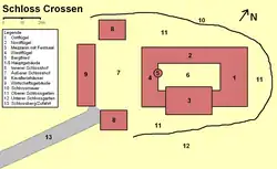 Das Schloss liegt nordwestlich von Crossens Ortskern auf einem Berg. Es umfasst das vierflügelige Hauptgebäude im Osten, welches den Bergfried integriert und den inneren Schlosshof umschließt. Im Südflügel des Hauptgebäudes liegt der barocke Festsaal, der sich über zwei Etagen erstreckt. Westlich dieses Komplexes liegt der äußere Schlosshof, der im Osten vom Hauptgebäude, im Westen vom ehemaligen Wirtschaftsgebäude und im Norden und Süden von zwei symmetrischen Kavaliershäusern flankiert wird. Zwischen dem südlichen Kavaliershaus und dem Wirtschaftsgebäude liegt der Eingang der Schlossanlage. In den 1960er-Jahren wurde hinter dem Wirtschaftsgebäude noch ein Internatsgebäude errichtet, welches heute ebenfalls zur Anlage zählt. Umgeben ist das Schloss von der größtenteils erhalten gebliebenen Burgmauer. Zwischen ihr und dem Haupthaus liegt der verwilderte Schlossgarten. Südlich des Burgbergs liegt der ehemalige Schlosspark mit einem weiteren Nebengebäude. Ein Teil des unteren Schlossgartens wurde 1949 zum Sportplatz von Crossen umgestaltet.
