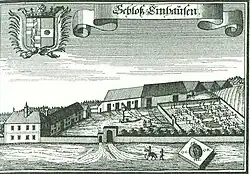 Da diese Radierung aus der Zeit um 1721 stammt, ist zu vermuten, dass hier nicht die abgegangene Veste, sondern der Bauernhof bzw. die Taverne von Einhausen abgebildet sind.