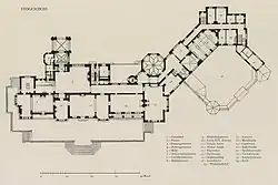 Auf alten Fliegeraufnahmen kann man besonders deutlich erkennen, dass es sich bei dem Gesamtbauwerk um eine langgestreckte, asymmetrische Schlossanlage handelt (Mehrflügelanlage mit zwei- bzw. dreifacher Abwinklung). Dabei erinnert das Erscheinungsbild des Herrschaftsflügels deutlich an englische Schlösser bzw. an stattliche Herrensitze des späten Mittelalters. Die ankommenden Besucher sehen das Schloss von der Hofseite aus, d. h. von der Empfangsseite her, als Zweiflügelanlage mit weit gespreizten Hofwinkel und einem – zum Herrschaftstrakt gehörenden – Hauptturm (am Übergangsbereich zum Wirtschaftstrakt).