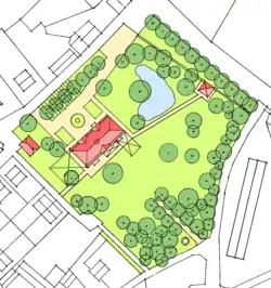 Das Anwesen ist von den Resten eines ca. 6.000 m² großen Schlossparks, früher Schroedels Park genannt, umgeben, in dem sich im Südosten ein runder, zweistöckiger, 1907 vom Charlottenburger Architekt R. M. Schmidt für die von Schroedel-Siemauschen Besitzer projektierter, Aussichtsturm mit Wendeltreppe im Innern und einer Zinnenbekrönung befindet. Ein quadratisches dreiachsiges Teehäuschen, mit Schieferwalmdach über kleinem Bogengiebel an jeder Seite und eingeschossigem Turmaufbau, ist der Rest zweier Lusthäuschen, die bei der Anlage des ehemals barocken Parkes gebaut wurden.