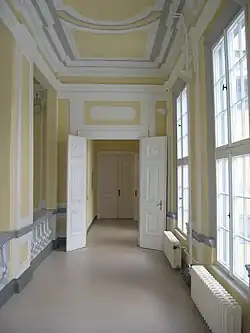 Im Mitteltrakt und dem nördlichen Seitenflügel (hier ist noch die auf quadratischem Grundriss erbaute großzügige Treppe mit schweren Balustern erhalten, die Wände des Treppenhauses sind mit ionischen Pilastern gegliedert, während die flache Decke eine einfache Kassettenteilung zeigt) lagen ursprünglich die herrschaftlichen Räume. Der Haupteingang des Schlosses befand sich in der Mittelachse des Gebäudes, die einstige Eingangshalle mit ionischen Wandsäulen ist inzwischen jedoch verbaut. Noch teilweise erhalten ist ein sich ursprünglich an die Halle anschließender achteckiger Raum mit Muschelnischen und Spiegelgewölbe. Das Obergeschoss des Mitteltrakts enthält in der Achse, der Straße zugewandt, einen großen Saal mit einfachen Deckenstuckaturen. Gartenseitig schließt sich eine Galerie an, die eine verkleinerte Kopie des Spiegelsaales von Versailles darstellte. Nach 1945 wurden jedoch die Spiegel sowie fast alle Wand- und Deckenstuckaturen entfernt, lediglich die Pilaster an den Wänden blieben erhalten. Von der Galerie führt ein Balkon mit zierlichem schmiedeeisernem Geländer zum einstigen Barockgarten auf der Ostseite des Schlosses. Einige Räume des Obergeschosses weisen noch heute Stuckaturen mit Engeln und Girlanden im Stil des Rokoko auf, die teilweise durch später eingezogene Zwischenwände unterbrochen sind.