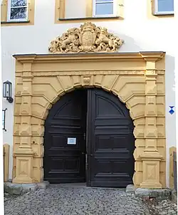 Die gesamte Schlossanlage besteht aus zweigeschossigen Gebäuden des 18. Jahrhunderts. Die 61 Meter lange Fassade des Schlosses befindet sich im Osten, hier wurde auch das zentrale Eingangsportal angebracht. Das rundbogige Portal wird von zwei rechteckigen Pilastern eingerahmt. Plastische Diamantquader sind sowohl an den Pilastern als auch am Gewände des Portals angebracht. Als Schlussstein wurde ein Steinmetzzeichen auf einem Wappenrelief eingesetzt. Ein geviertes Wappen der Grafen von Schönborn aus dem späten 17. Jahrhundert prangt oberhalb des Portals.[9]