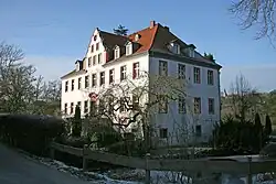Von der Vorburg führt an deren Nordseite eine von rustizierten, vasentragenden Pfeilern flankierte Bogenbrücke zum Herrenhaus mit ziegelgedecktem Walmdach und zahlreichen Gauben. Die Brücke ist heute ohne tatsächliche Funktion, denn an der Zugangsseite ist das Haupthaus nicht mehr von einem Wassergraben umgeben. Diesen gibt es nur noch im Westen, Norden und Süden. Das Gebäude ist ein schlichter, zweigeschossiger Rechteckbau auf einem hohen, tonnengewölbten Kellergeschoss. Hochrechteckige Fenster mit profilierten Gewänden aus rotem Sandstein[6] teilen die Fassaden an den Längsseiten in neun, an den Querseiten in vier Achsen. Das zweiflügelige Hauptportal mit profilierter Werksteinrahmung und bekrönendem flachen Dreiecksgiebel liegt in der Mittelachse der südlichen Fassade. Zu ihm führt eine mehrstufige Freitreppe hinauf. Die drei mittleren Achsen dieser Seite sind auf Dachgeschossniveau von einem zweigeschossigen, geschweiften Zwerchgiebel abgeschlossen. Er ist eine Zutat des frühen 20. Jahrhunderts und ersetzte einen früher vorhandenen Dreiecksgiebel.[6]
