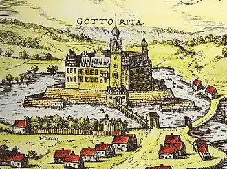 Nachdem Friedrichs Sohn Christian III. die Thronfolge angetreten hatte, erhielt dessen Halbbruder Adolf I. verstreute Gebiete in Schleswig und Holstein als Erbe und begründete so 1544 das Herzogtum Schleswig-Holstein-Gottorf. Schloss Gottorf wurde zur Hauptresidenz und namensgebend für die Linie.[19] In der Neujahrsnacht 1564/65 traf eine erneute Brandkatastrophe das Schloss und in der Folge wurde es in unterschiedlichen Bauschritten zur vierflügeligen Festungsanlage ausgebaut. Von der regen Bautätigkeit Herzog Adolfs ist auf Gottorf der Nordflügel erhalten geblieben,[19] weitere Bauten seiner Herrschaft waren unter anderem die Nebenresidenzen von Husum und Reinbek. Die Verwaltung der Herzogtümer war zu dieser Zeit fast vollständig aufgesplittert in die von den Schleswiger Herzögen beherrschten Gottorfischen Teile, in die vom dänischen Königshaus beherrschten und zumeist durch Statthalter verwalteten Königlichen Teile sowie in die von beiden Linien regierten Güterbezirke. Das Gottorfer Schloss als Sitz der Verwaltung des herzoglichen Anteils wuchs in dieser Zeit zur größten Schlossanlage in Schleswig und Holstein. Zu seinen Glanzzeiten bestand der Hofstaat aus mehr als 400 Personen.[20]