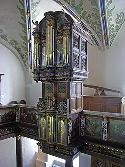 Gleichfalls in der Schlosskapelle befindet sich an der dem Altar gegenüberliegenden Emporenbrüstung eine von Mads Kjeersgard 1997–2004 rekonstruierte Renaissanceorgel im originalen historischen Gehäuse. Deren Oberwerksprospekt stammt noch aus der Vorgängerkapelle und wurde dort 1567 von Johann von Groningen erschaffen. Gottschalk Burchert übertrug ihn 1591 in die jetzige Kapelle und fügte 1625 noch ein Unterpositiv hinzu. Bei der Rekonstruktion wurde das 1725 von Hinrich Wiese hinzugefügte angehängte Pedal wieder entfernt, so dass die Orgel heute – bei mechanischer Spiel- und Registertraktur – über 18 Register (darunter fünf halbe) auf zwei Manualen verfügt.[41]