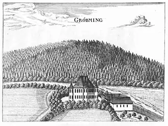 Der Schlossbau dürfte aus dem 16. Jahrhundert gestammt haben. Wie auf dem Stich von Georg Matthäus Vischer aus dem Jahr 1674 zu sehen ist, war Schloss Gröming eine dreigeschoßige und mit einem Walmdach gedeckte Anlage, die von einem Wassergraben umgeben war. Das Schloss besaß vier Ecktürme. Außerhalb befand sich der Meierhof, dieser besteht heute ebenso wenig wie das abgebrochene Schloss.