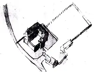 1688 bestand das Schlossareal aus einem großen Wohnbau auf der Ostseite und dem grundsätzlich heute noch bestehenden Bau auf der Südseite. Im Norden und Westen war das Gelände durch eine Mauer mit Schießscharten geschützt, und in der westlichen Mauer stand ein Torturm. Dieser gesamte überbaute Bereich war von einem Weiher umgeben. Die Meierei und die Wirtschaftsgebäude befanden sich außerhalb des Weihers auf der Westseite.[6]