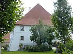 Ehemals Schloss, dann Bauernhaus, zweigeschossiger, nahezu quadratischer Walmdachbau, im Kern 16./17. Jahrhundert