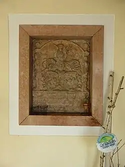 „Schlosstafel des ehemaligen Hofmarksschlosses Zweigeschossiger Rundling mit Pyramidendach, bezeichnet mit „1554“; Wappentafel mit Bauinschrift, Rotmarmor, bezeichnet mit „1554“.“