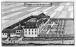 Dieser Lehnshof war Anfang des 15. Jahrhunderts im Besitz von Ullein den Herbersteiner, der ihn an seinen Neffen Andree von Akspekch übergab. Am 10. August 1415 verkaufte dieser den Hof an die Brüder Andree und Jörg von Herberstein. 1480 befand sich der „Edelhoff zu Harmsdorff“ im Besitz von Andrä Span, welcher ihn mit dem Moserhof-Schlössl verband. Der Hof wurde wahrscheinlich am Ende des 15. Jahrhunderts zerstört. An seiner Stelle wurde das Schloss errichtet. Die Kinder und Stiefkinder von Andrä Span hatten den Grund 1521 in Besitz. Vom späteren Besitzer Wolfgang Vogl wurde das Grundstück vermutlich freigelöst.