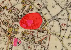 Das Gebäude ist ein kastenförmiger, dreigeschossiger Walmdachbau mit zweigeschossigen Anbauten nach Westen und Süden über einem unregelmäßigen Grundriss; im Kern stammtz das Gebäude aus dem Jahr 1551. Bemerkenswert ist das Torhaus, ein zweigeschossiger traufständiger Steildachbau mit Strebepfeilern und einer mittleren Durchfahrt; darüber befindet sich eine Wappentafel, bezeichnet mit „1551“. Über dem Nebeneingang steht die Jahreszahl „1878“. Reste der Ringmauer befinden sich im Westen und Süden; diese ist aus Bruchsteinen errichtet und stammt wohaus dem 16./17. Jahrhundert.[2]