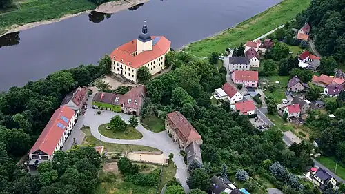Blick über die Elbe auf Schloss Hirschstein (2016) -