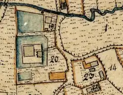 Der Stich von Michael Wening von 1726 zeigt ein beinahe quadratisches und zweigeschossiges Hofmarkschloss, das von einem Walmdach mit Gaupen gedeckt ist. Das barocke Schloss ist Anfang des 18. Jahrhunderts an der Stelle einer Wasserburg errichtet worden. Das Schloss ist von einem Wassergraben umgeben, über den eine Brücke zu dem Schloss führt. Die durch den Wassergraben gebildete Insel wird am Rand von einem Holzzaun und dann von einer Schlossmauer umzäunt, diese besitzt auf der Ostseite ein prunkvolles Eingangsportal und an der Westseite einen kleinen Turm. Das Schloss liegt an der Nordwestecke. Außerhalb der Insel liegen ein großer Sedelhof und weitere Gebäude, die eine durch ein Tor geschlossene Hofanlage bilden. Im Hintergrund ist noch die alte Ortskirche St. Margareta zu erkennen, die 1905 durch einen Neubau ersetzt wurde. Bei der Bayerischen Uraufnahme um 1830 sind die Anlage und ein nördlich liegender Teich noch vollständig vorhanden. Im Zuge der Entwässerung der Aiterach durch den Reichsarbeitsdienst in den 1930er Jahren verschwanden die Wassergräben um das Schloss.