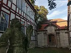 An die überdachte Hofeinfahrt mit Schlupfpforte schließen sich die an der Südseite gelegenen Wirtschaftsgebäude aus dem 17./18. Jahrhundert an. Es handelt sich hierbei um zwei einfache Fachwerkhäuser und ein ehemaliges Stallgebäude auf teilweise massiv ausgeführtem Erdgeschoss. Sie dienen heute Wohnzwecken. Der dreiseitig geschlossene Hof wird durch einen Spalierzaun vom 1992 rekonstruierten barocken Schlosspark abgegrenzt, welcher sich in seinem Aufbau seit 1720 grundlegend verändert hat.[10] In diesem befinden sich Wasserflächen sowie ein Springbrunnen, Hecken, alte Rosenstöcke, Terrassen und Laubengänge. Ursprünglich befand sich in der Südostecke des Parks noch ein Lusthäuschen, welches aber in den 1950er Jahren abgebrochen wurde.