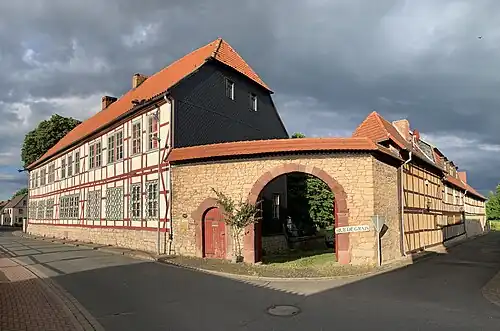 Die dreiseitige Hofanlage mit dem zweigeschossigen barocken Herrenhaus in einfacher Fachwerkbauweise und Bruchsteinsockel sowie Krüppelwalmdach überstrahlt die landwirtschaftlichen Nebengebäude. Die Ostfassade ziert ein Zwerchhaus, auf der Hofseite führt eine Freitreppe auf die dem Haus vorgelagerte Terrasse mit Barockskulpturen. Die Bibliothek wurde als Massivbau aus behauenem Muschelkalkstein mit Mansardwalmdach und durch Pilaster gegliederter Fassade errichtet. Das Eingangsportal besteht aus behauenem roten Sandstein. Ein segmentbogenförmiger Ziergiebel rahmt das von Wilke/von Wurmbsche Allianzwappen ein.