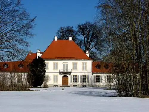 Der zweigeschossige Mittelbau des Schlosses besitzt ein Walmdach und – mit Ausnahme von Rundfenstern in den äußeren Flügelachsen – rechteckige Fenster. Das Hauptgebäude wurde in den Jahren 1820 bis 1830 um die äußeren Achsen der eingeschossigen Seitenflügel erweitert. In der Decke des Südwestzimmers im Erdgeschoss befinden sich Reste eines Orgelflügels aus St. Martin in Memmingen. Weitere Fragmente dieser Flügel sind in der Decke des Treppenhauses und im oberen Flurgang eingelassen. Das Treppenhaus verfügt über ein Eichenholzgeländer mit Empiremotiven. Der sogenannte Saal und die zwei Nebenzimmer des Obergeschosses sind mit zweigeschossigen Öfen bestückt. Die Unterteile der Holzfeuerstellen sind aus Gusseisen, die Oberteile haben eine Vasenbekrönung aus Terrakotta.