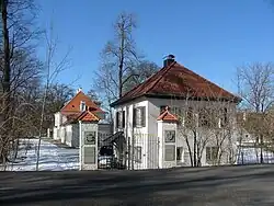Das zweigeschossige Wirtschaftsgebäude liegt nördlich des Wohngebäudes und besitzt ein Walmdach. Unmittelbar daneben befindet sich ein etwas kleineres Gebäude, der sogenannte Stadel. Auch er hat ein gewalmtes Dach mit Schleppgauben. Am Gartentor sind an den Stirnseiten der Pfeiler je zwei Sandsteintafeln mit Wappen und Inschriften angebracht. Durch das Gartentor gelangt man in den Außenpark, der durch die Staatsstraße St 2009 vom Innenpark getrennt ist. In diesem befindet sich ungefähr 250 m südlich des Schlosses die Nachbildung einer Skulptur des M. Antonius Antius Lupus, des angeblichen Ahnherrn der Familie Lupin. Das Original befindet sich an der Via Appia in Rom. Auf der Anhöhe, 800 m südlich des Schlosses, ließ der Schlossherr einen Obelisken zum Andenken an ein geliebtes Reitpferd aufstellen. Zwischen den beiden Denkmälern befindet sich eine Tulpenbaumallee und ein kleiner Park.