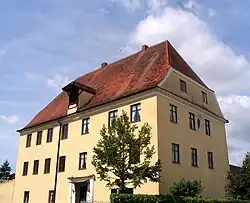 Das Schloss ist ein dreigeschossiger Bau aus dem 17. Jahrhundert mit einem Schopfwalmdach und gehört heute zu einem landwirtschaftlichen Betrieb. Es besitzt ein zweiflügeliges Portal mit einem Konsolgesims, einer Portalrahmung und einer Vorhalle. An der östlichen Traufseite befindet sich eine Aufzugsgaube. Zu der Anlage gehört ein zweiflügeliger und zweigeschossiger Stadel mit einem Krüppelwalmdach aus dem 18. Jahrhundert. Das Schloss wurde vermutlich an der Stelle einer Burganlage errichtet; es gibt aber auch die Vermutung, dass sich die ehemalige Burg an der Stelle der heutigen Dorfkirche befand und die Burg später zur Dorfkirche umgebaut wurde. Aufgrund fehlender baugeschichtlicher Untersuchungen kann diese Deutung nicht entschieden werden. Nach einer Nennung von 1737 gehörten zu der Burg ein „gemauerter Turm“, vermutlich ein heute abgegangener Bergfried, ein Wohngebäude und ein Wirtschaftshof.