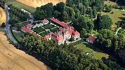In der Nähe des Kastells ließ Franz Adam von Trauttmansdorff 1724 ein Barockschloss nach den Entwürfen des Prager Architekten Franz Maximilian Kaňka errichten, das ein französischer Garten umgab. Den Rokoko-Saal schmückt ein Deckenfresko aus dem Jahr 1754[1] mit der Darstellung des Olymps von Felix Anton Scheffler, der im selben Jahr auch das Deckengemälde der Heiligen Dreifaltigkeit in der Schlosskapelle schuf. Wenzel Lorenz Reiner schmückte den Chor mit der Szene Christi Himmelfahrt und allegorischen Darstellungen und Tugenden aus.