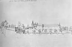 Ludger ließ die alte gotische Wasserburg unter teilweiser Verwendung der alten Bausubstanz bis 1663 zu einem repräsentativen Barockschloss um- und ausbauen. Das herrschaftliche Wohnhaus an der Südwest-Ecke der Anlage, Oberhaus genannt,[21] erhielt nicht nur große Rechteckfenster und ein neues Dach, sondern seinen zwei im rechten Winkel aneinanderstoßenden Flügeln wurde auch ein quadratischer Eckturm mit geschweifter Haube und Laterne angefügt. Das Hauptaugenmerk bei den Arbeiten lag aber auf der Vergrößerung der Vorburggebäude. Die alten Ökonomiebauten ließ Ludger vollständig niederlegen und anschließend eine neue vierflügelige Vorburg errichten,[21] die mehr als doppelt so groß wie ihre Vorgängerin war. Gemeinsam mit dem Herrenhaus hatte das Schloss nun seine bis heute erhaltene viereckige Grundrissform und war von einem neu ausgehobenen Wassergraben umgeben. Eine Zeichnung des wallonischen Malers Renier Roidkin aus der Zeit um 1720/1730 zeigt Schloss Kalkum nach den Umbau- und Erweiterungsarbeiten. Zum damaligen Baubestand gehörte eine Schlosskapelle nördlich des zweigeschossigen Herrenhauses. Auf diesen nicht mehr erhaltenen Bau deutet ein auf der Roidkin-Zeichnung dargestellter Dachreiter hin. Zudem lässt ein Steinfundament, das an der entsprechenden Stelle gefunden wurde, auf einen Altar schließen.[22] An der Nordost-Ecke der Vorburg stand ein polygonaler Eckturm mit doppelt geschweifter Barockhaube, der heute nicht mehr erhalten ist. Über den südlichen Wassergraben führte eine Holzbrücke zu einem Vierecksturm mit Tor.