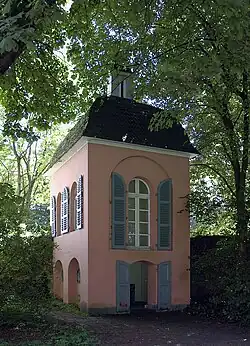 Am Rand des südlichen Wassergrabens steht an der östlichen Umfassungsmauer eine kleine Orangerie, die den großen unter Weyhe erbauten Orangeriebau ersetzte. Sie wurde 1965/66 grundüberholt.[77] Etwas südlich davon lehnt sich der einstige Gartenpavillon, auch Sommerhaus und Teehaus genannt, von innen an die Ostmauer. Der kleine turmartige Putzbau besitzt wie das Schloss einen rosafarbenen Anstrich und ist von einer barocken Schweifhaube mit Laterne abgeschlossen. Seine genaue Entstehungszeit ist unbekannt, möglicherweise geht er auf Pläne Georg Peter Leydels zurück.[118] Fest steht, dass er nicht im Zusammenhang mit den Parkplänen Maximilian Friedrich Weyhes errichtet wurde, sondern zu jener Zeit schon existierte. Während der großen Umbauarbeiten in der ersten Hälfte des 19. Jahrhunderts wurde mehrfach im Pavillon gearbeitet. So stammt seine Ausmalung zum Beispiel von Ludwig Pose, der auch für die Wand- und Deckenmalereien im Herrenhaus verantwortlich war.[119] Das Gartenhaus wurde 1975 anlässlich des 150. Geburtstags Ferdinand Lassalles zu einer Gedenkstätte für ihn ausgebaut. Der Innenraum des Gebäudes ist als Kenotaph gestaltet. Ein Block aus grünem italienischem Marmor besitzt die Form eines Sarkophags, drüber steht auf einer Marmorkonsole die Büste Lassalles. An der nördlichen Außenwand des Pavillons hängen in zwei flachen Nischen Tafeln aus dem gleichen Marmor mit einem Ausspruch Ferdinand Lassalles sowie Daten zu seinem Leben und Wirken.