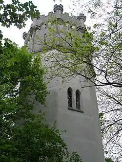 Das heutige Schloss wurde 1841 bis 1846 für den Grafen Emanuel Zichy de Ferraris (1808–1877)[2] im Tudor-Stil, der damals in England vorherrschenden Neugotik, erbaut; Fassade: Arch. Franz Beer[3], Wien, Bauausführung Ignaz Feigler d. Ä., Preßburg (Feigler (Familie)#Ignaz Feigler der Ältere); eine Reverenz des Bauherrn an seine englische Gattin, Lady Charlotte Strachan († 12. November 1851).[4] Das von einem weitläufigen englischen Landschaftspark umgebene Gebäude (die Gutsfläche umfasste 24 Quadratkilometer beiderseits der Donau) ersetzte einen im Jahr 1521 errichteten Vorgängerbau am selben Standort. Der Grundstein wurde am 11. Juni 1843 von dem österreichischen Kanzler Klemens Wenzel Lothar von Metternich gelegt, der ein Schwager des Schlossherren war.[5] Als Besitz der Zichys war Schloss Karlburg oft Ort der Geburt und der Heirat von Mitgliedern der Aristokratie. Es hatte den Spitznamen das „ungarische Windsor“.