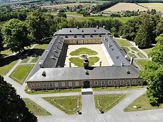 Das klassizistische Jagdschloss wurde Ende des 18. Jahrhunderts als vierflügeliges einstöckiges Gebäude um einen rechteckigen Innenhof erbaut. Den Entwurf lieferte der Architekt Johann Ignaz Palliardi, geleitet wurde der Bau vom Baumeister Václav Haberditz. Später wurden noch eine Kapelle, eine Reithalle und ein Pferdestall, dem gegenüber sich das Lakaienhaus befindet, errichtet. Die Innendekoration nahm der berühmte Prager Maler und Dekorateur Antonín Tuvora vor, der mit der Al-secco-Technik die Wandflächen der meisten Räume ausschmückte. Das ursprüngliche Mobiliar stammt aus der Zeit des Rokoko und des Klassizismus.