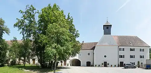 Der dreiflügelige, zweigeschoßige ehemalige Gutshof übertrifft das Schloss heute in seinen Ausdehnungen und entstand um 1600. Die Fenster sind teilweise mit Sgraffitorahmen ausgestattet, die Wirtschaftstrakte mit Spitzkappentonnengewölben. Bei der Errichtung der Umfahrung um das Schloss im Jahr 2001 musste das Fundament des Gutshofes unterfangen und das Mauerwerk gestützt werden. In diesem Bereich wurde der Kreisbach zudem auf einer Länge von 80 m vom Gutshof weg verlegt.[3]
