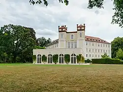 An der Stelle des heutigen Bauwerks befand sich eine mittelalterliche Wasserburg. Etwa um 1600 erfolgte dann ein Umbau zum Schloss im Stil der Renaissance. Ihr heutiges Aussehen erhielt die Anlage im Wesentlichen in den Jahren 1817 bis 1820 von Carl August Benjamin Siegel. Die beiden Türme an der Rückfront des Schlosses wurden aber erst 1839 von Homann angebaut. Die umgebende neun Hektar große Parkanlage im englischen Landschaftsstil entstand ab 1820 und wurde durch H. W. und J. E. Freschke angelegt.[1] Die Pläne gehen auf Peter Joseph Lenné zurück.