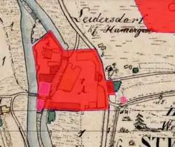Auf dem Stich von 1730 besteht das Anwesen aus einem dreigeschossigen Herrenhaus mit einem Mittelrisalit und einem Walmdach mit Schleppgaupen. Durch eine Mauer und weitere Wirtschafts- und Wohngebäude wird ein unregelmäßiges Viereck gebildet, in dessen Mitte sich das Hammerwerk befindet. Eine Holzbrücke über die Vils führt zu dem Anwesen. Der gegenüberliegende Ausgang durch ein rundbogiges Tor führt vermutlich zu der Kapelle St. Antonius.