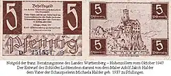 Im Oktober 1947 wurde während der französischen Besatzung nach dem Zweiten Weltkrieg auf einem 5-Pfennig-Behelfsgeldschein des Landes Württemberg-Hohenzollern das Schloss Lichtenstein abgebildet.