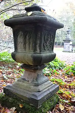 Auf der Ebene der Gartenterrasse wurde eine 1718 datierte Scheinvase aus Sandstein aufgestellt mit den verschlungenen Buchstaben EAVP,[9] den Initialen des Sohnes des Lindener Schlossbauherren, des Geheimen Rats und Oberkämmerers Ernst August Graf von Platen-Hallermund. Ernst August, vor allem aber Sophie[10] oder Sophia, geborene von Uffeln, seine Ehefrau,[11] ließ das Schloss Montbrillant in der später Welfengarten genannten Anlage der Herrenhäuser Gärten planen.[10]