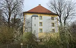 Früher stand dort eine Turmhügelburg. Im Laufe des 16. Jahrhunderts wurde eine Wasserschlossanlage errichtet, die 1723 durchgreifend erneuert wurde. Der Stich von Michael Wening von 1721 zeigt einen viergeschossigen Bau mit Satteldach und einige Gaupen. Zwei Kamine sind als Dachreiter gestaltet. Neben dem Wohnbau ist die Schlosskapelle St. Valentin (um 1714 entstanden) zu erkennen, die an der Südostecke angebaut ist. Beide sind durch eine nicht allzu hohe Mauer und einen Wassergraben geschützt. Außerhalb der Anlage sind Wirtschaftsbauten und ein eingezäunter Schlosspark mit einem Brunnen, aus dem eine Wasserfontäne aufsteigt, zu erkennen.