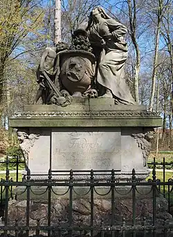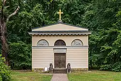 Im südlichen Bereich des Schlossparks, hinter dem Kleinen Marstall, befindet sich ein weiterer Kirchenbau. Das Helenen-Paulownen-Mausoleum wurde 1804 bis 1806 für die Großfürstin Helena Pawlowna, Gemahlin des Erbprinzen Friedrich Ludwig von Mecklenburg und Tochter von Zar Paul I. errichtet und enthielt zugleich eine kleine russisch-orthodoxe Kapelle. Es ist ein klassizistischer Tempelbau, für dessen Errichtung vermutlich der französische Architekt Joseph Ramée verantwortlich zeichnete.[65] Im gesamten Park befinden sich zahlreiche Denkmäler und Standbilder. Das von Rudolf Kaplunger um 1788 gefertigte Denkmal für Herzog Friedrich den Frommen nördlich der Grotte ist eine von einem schmiedeeisernen Schmuckzaun eingefasste Sandsteingruppe auf einem Piedestal. Das Denkmal stand einst auf einer kleinen von Pappeln umgebenen Insel, deren Wassergräben später zugeschüttet wurden. Eine an Großherzog Friedrich Franz III. erinnernde Büste von Hugo Berwald befindet sich seit 1936 am Übergang des Rasenparterres zum Blumengarten, ein Bronzestandbild seines Ururgroßvaters Friedrich Franz I. steht auf dem Schlossplatz vor dem Altan. Das Pferdedenkmal am Forsthaus ist ein vor 1785 erbautes Grabmal für das Lieblingspferd des Herzogs Friedrich; ein 1922 geweihtes Ehrenmal von Hugo Berwald erinnert an die gefallenen Mitglieder des Jägerbataillons.