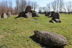 - ↑ (dän. Langdysse) ist die in Dänemark gebräuchliche Bezeichnung für Dolmen die in einem rechteckigen Hünenbett liegen, im Gegensatz dazu sind Runddolmen jene Dolmen, die im Rundhügel liegen