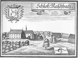 1721 wurde Maasbach von Michael Wening in einem Kupferstich abgebildet. Er nennt das Landgut Mäßbach und berichtet: Ist ein Hofmarch im Gericht Schärding / Bistumbs Passau / vnweit von der Statt Schärding entlegen / hat neben denen Underthonen ein Adelichen Sitz / dessen der vndere Gaden gemauret / der obere aber von Holtz gemacht ist. Der Innhaber ist Herr Frantz Felix Baumgartner / befind sich schon in die fünfftzig Jahr bey diser Familia, warzue es durch Heyrath von denen Häckl=Ederischen kommen. Maasbach war damals ein zweistöckiger Bau mit einem Turm in der Mitte.[1] 1788 ging das Anwesen an Felix von Schott über, einen Verwandten der Herren von Baumgarten zu Deutenkofen und der Familie von Hackledt.