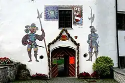Das Eingangsportal zeigt das Wappen der Freundsberger und der Schurff. Im äußeren Eingangsbereich wurden Ende der 1950er-Jahre zwei Rittergestalten aufgemalt.