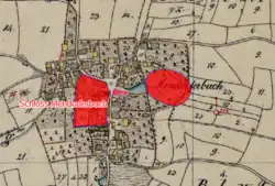 In Menderdorf befand sich als mittelalterlicher Sitz ursprünglich ein freistehender Turm; wie bei ähnlichen Bauten des hohen Mittelalters wird der Turm fünfgeschossig gewesen sein, mit einem Kellergeschoss, zwei darüber liegenden Wohngeschossen, die über eine Außentreppe erreichbar waren, und zwei weiteren Speichern und einem schindelgedeckten Zeltdach. An den Turm wurden später zwei Gebäude angebaut. Eine kleine Kapelle stand nördlich des Schlossensembles, Brunnen und Backofen lagen östlich des Schlosses.[2] Auf der Karte des Christoph Vogel von 1600 ist ein Schloss mit einem dahinter stehenden Turm eingezeichnet. Das Schloss war 1788 noch vorhanden. 1827 wurde die Schlosskapelle zu einem Stadel umfunktioniert. Im Kataster von 1830 ist im Flurstück 28 der Turm noch eingezeichnet, 1843 wird kein Schloss mehr in Mendorferbuch erwähnt. Wahrscheinlich wurden die Besitztümer zertrümmert und einzeln verkauft.