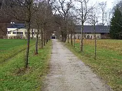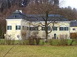 Zum Schloss gehört seit langem auch ein Wirtschaftstrakt mit einem Stallgebäude. Die Fortschrittlichkeit des landwirtschaftlichen Hofgebäudes (Wasserversorgung des Viehs, Fütterungsanlage, Licht) zur Zeit des Fürsterzbischofs Colloredo lobt Friedrich Graf Spaur außerordentlich. Der alte Stall besitzt reihig in sechs hintereinanderliegenden Feldern angeordnete Säulen, über denen ein Platzlgewölbe mit Gurtbögen errichtet ist. Im alten Stallgebäude war vor 1995 eine Tischlerei. Es sollte dann hier ein privates Fahrzeugmuseum eingerichtet werden, was bislang aber nicht zustande gekommen ist. Der östliche, einst vom Stall zuerst durch einen Weg getrennte Holzteil aus der Zeit nach 1800 wurde später mit dem Stall zu einem geschlossenen Bau mit einheitlichem Dach zusammengeschlossen.