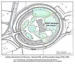 Nach der Bauaufnahme durch den Architekten Karl-Lothar Dietzsch für die Planung des Umbaus, der Restaurierung und für die Ergänzungen der Bestandsgebäude von 1976–1978[13] erfolgten bis 1984 mehrere Neubauplanungen, zunächst als geschlossene Ellipse[14] und dann in Form eines „stehenden Korbbogens“ (anstelle der Remisen) im Westen des Schlosses durch das Büro O.M. Ungers (mit St. Böhm, K.- L. Dietzsch, K. Nagel und Th. Will)..[15] Diese Konzepte, die sich an Ungers` Idee von der Grossform orientierten[16] mit einem „Museums-Eiland“ und einer „Umwallung“ durch Nebengebäude, die ein Kontinuum an ausstellungstechnischen Variationsmöglichkeiten vorsahen, wurden jedoch aufgegeben[17]. Von 1981 bis 1984 erfolgten durch dasselbe Büro aufwendige Umbau- und Renovierungsarbeiten, die sich allein an dem „ursprünglich barocken Planungsgedanken“ orientierten.[18]
